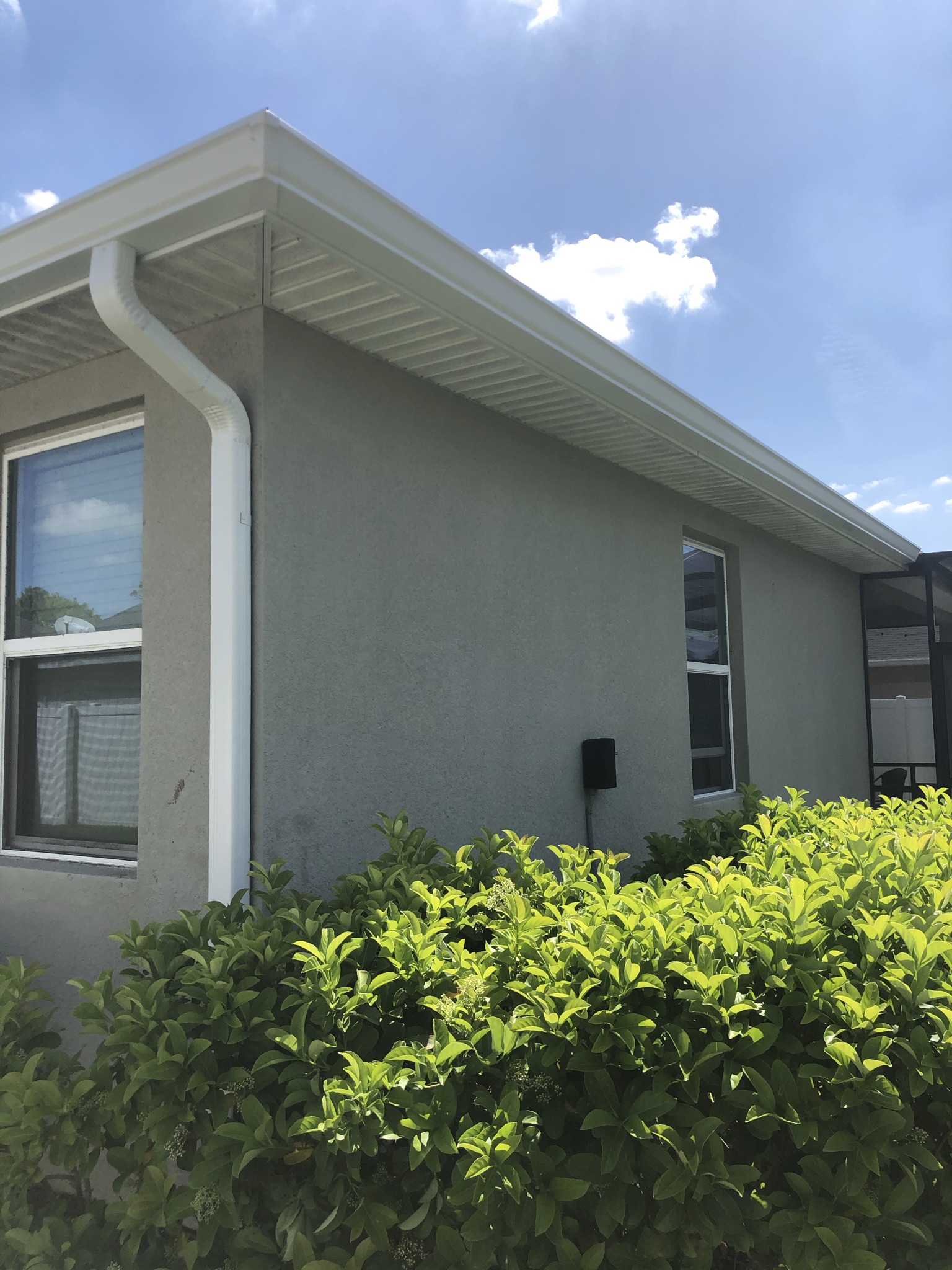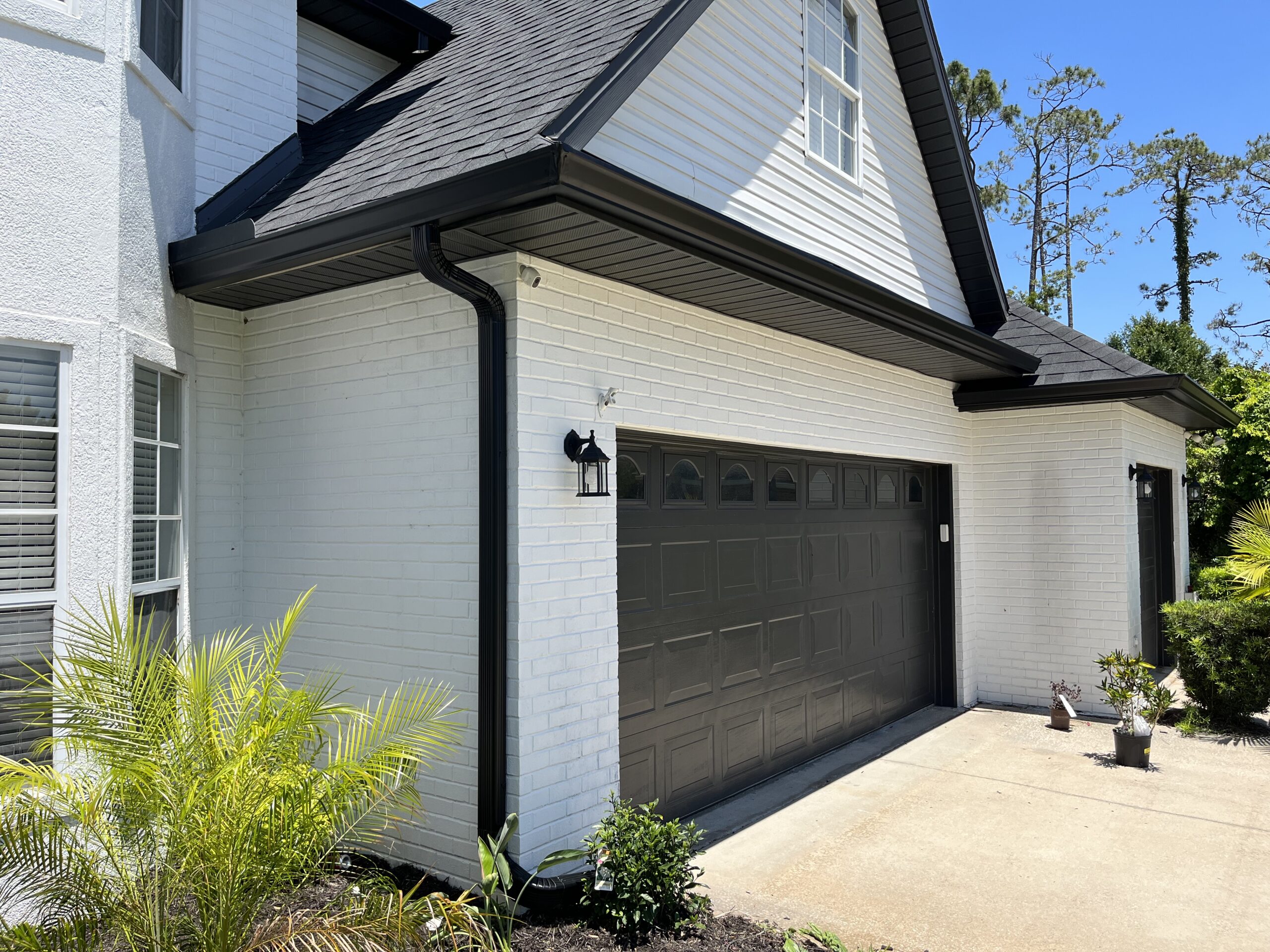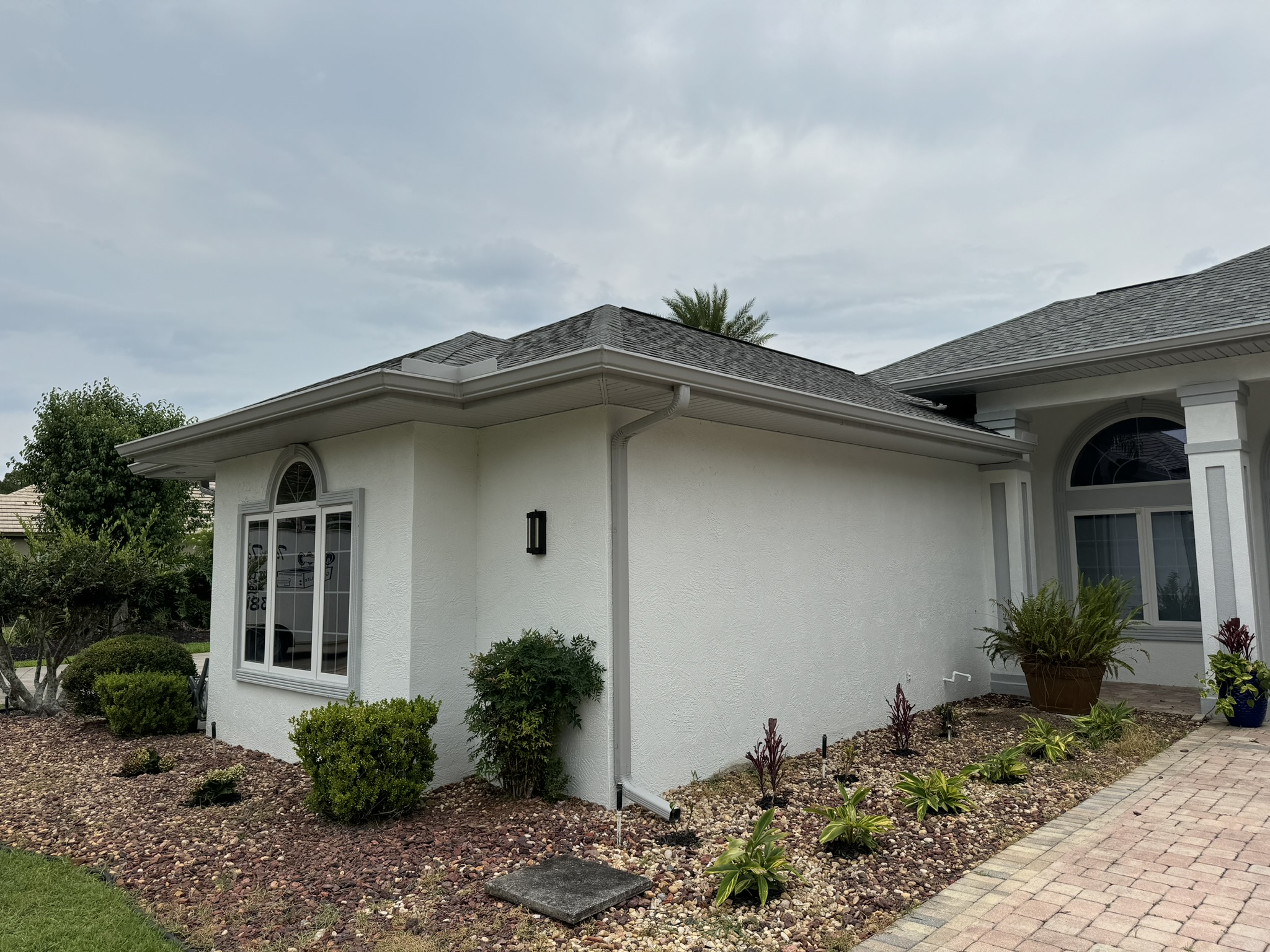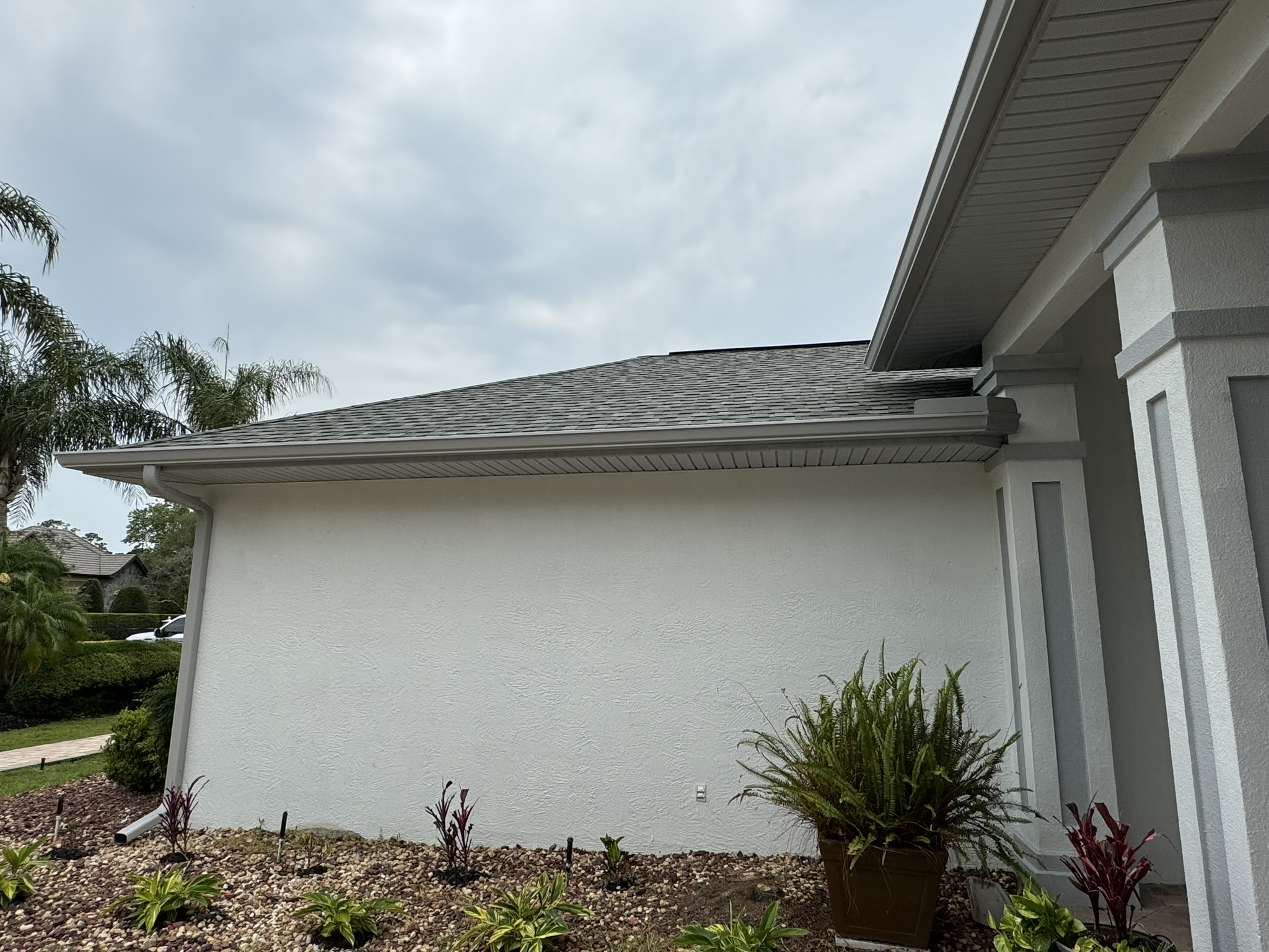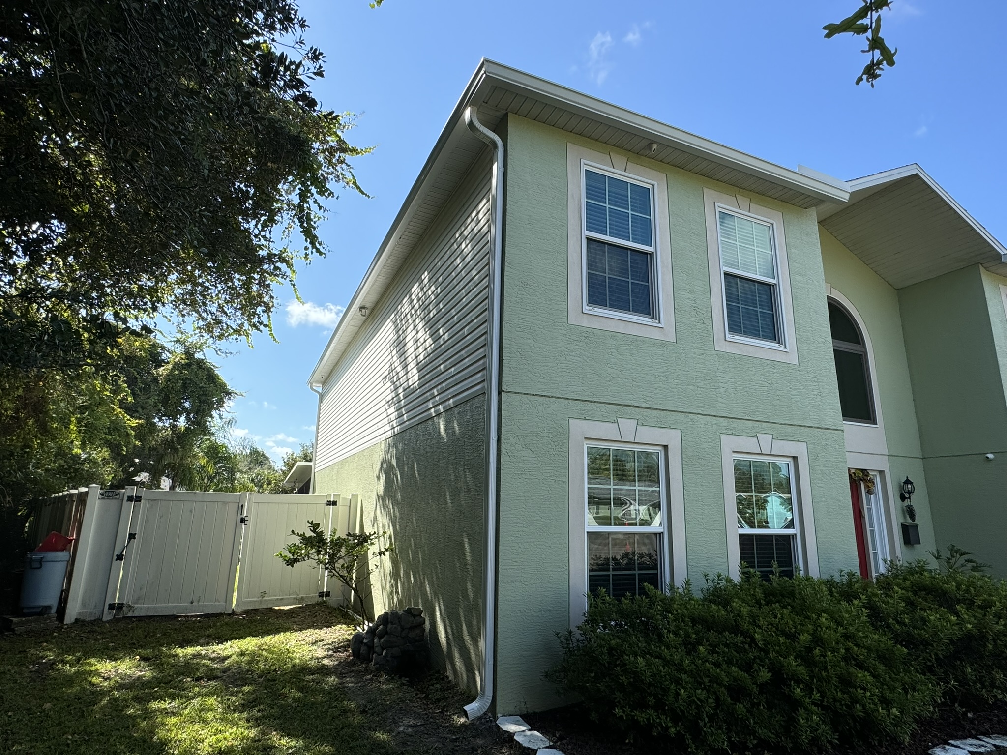 Two-Story Mastic White Gutters & Downspouts
