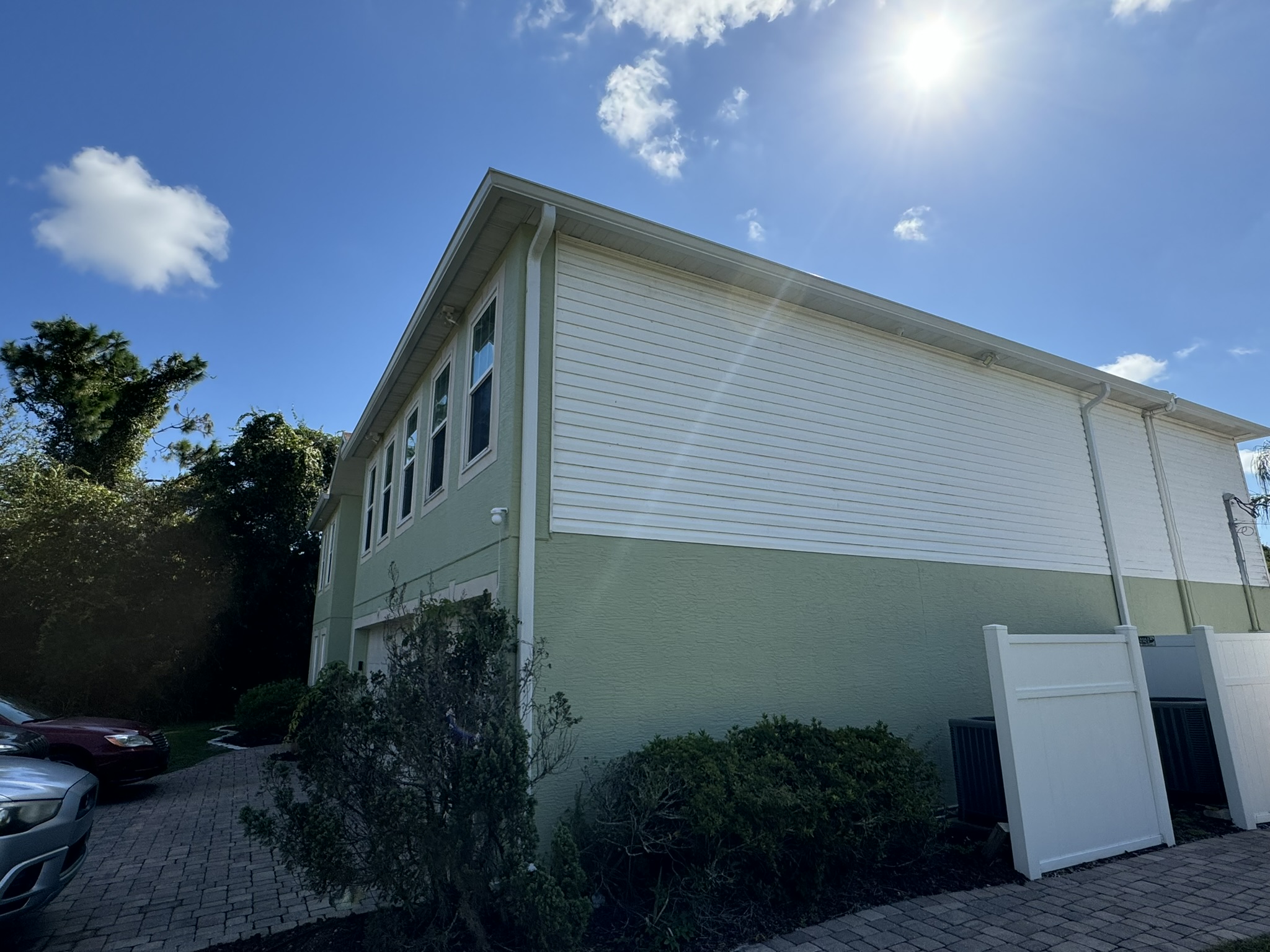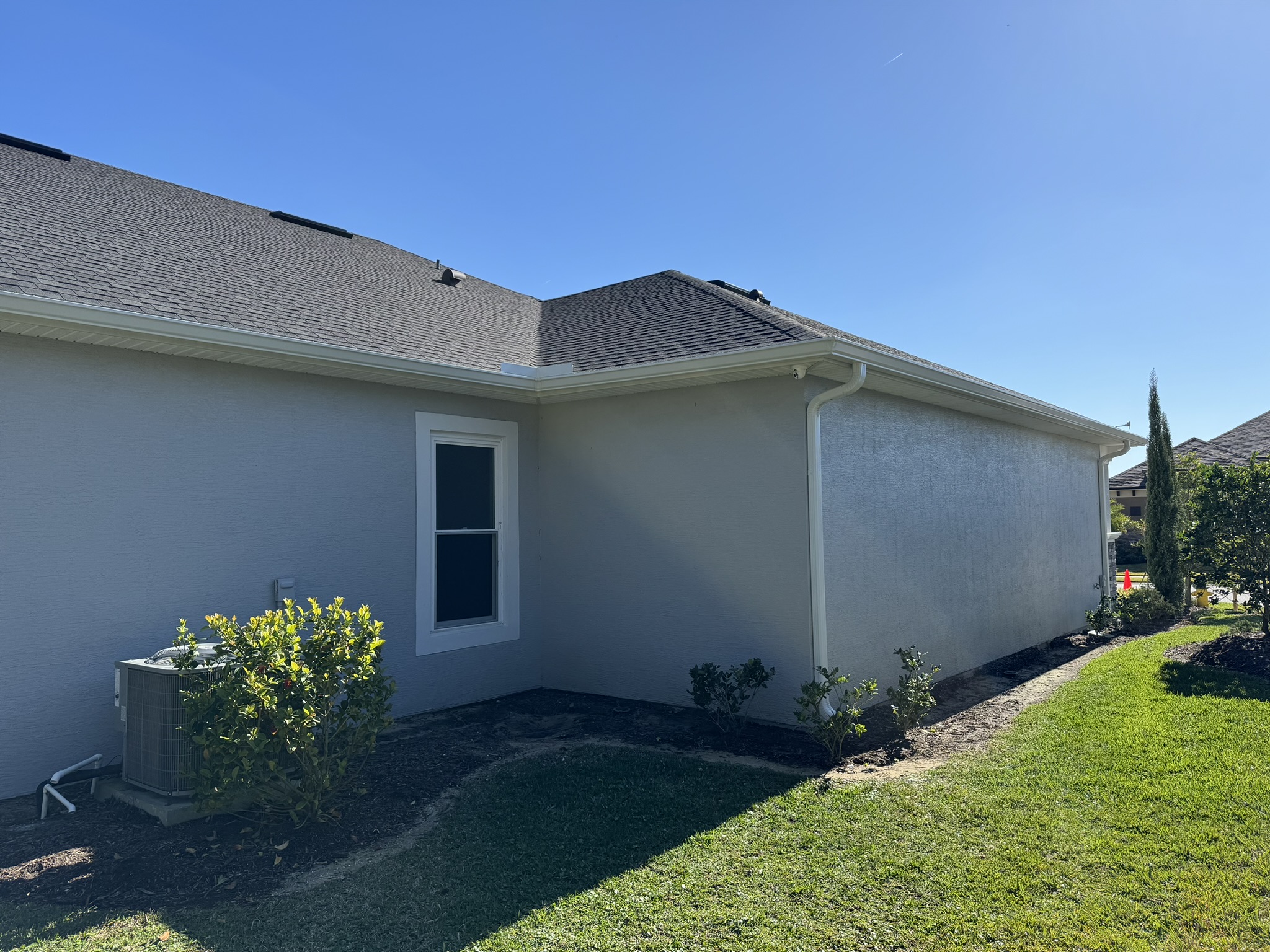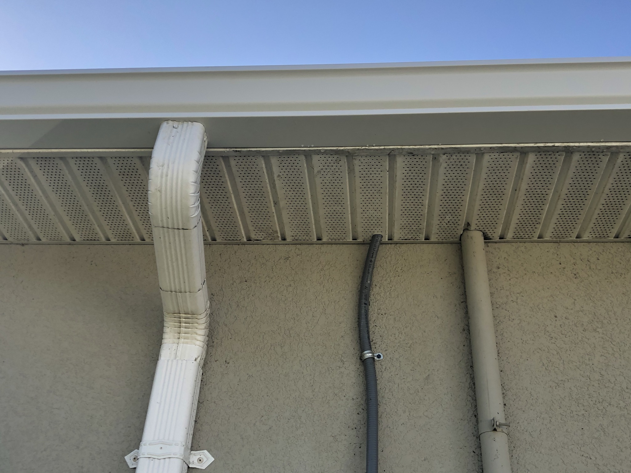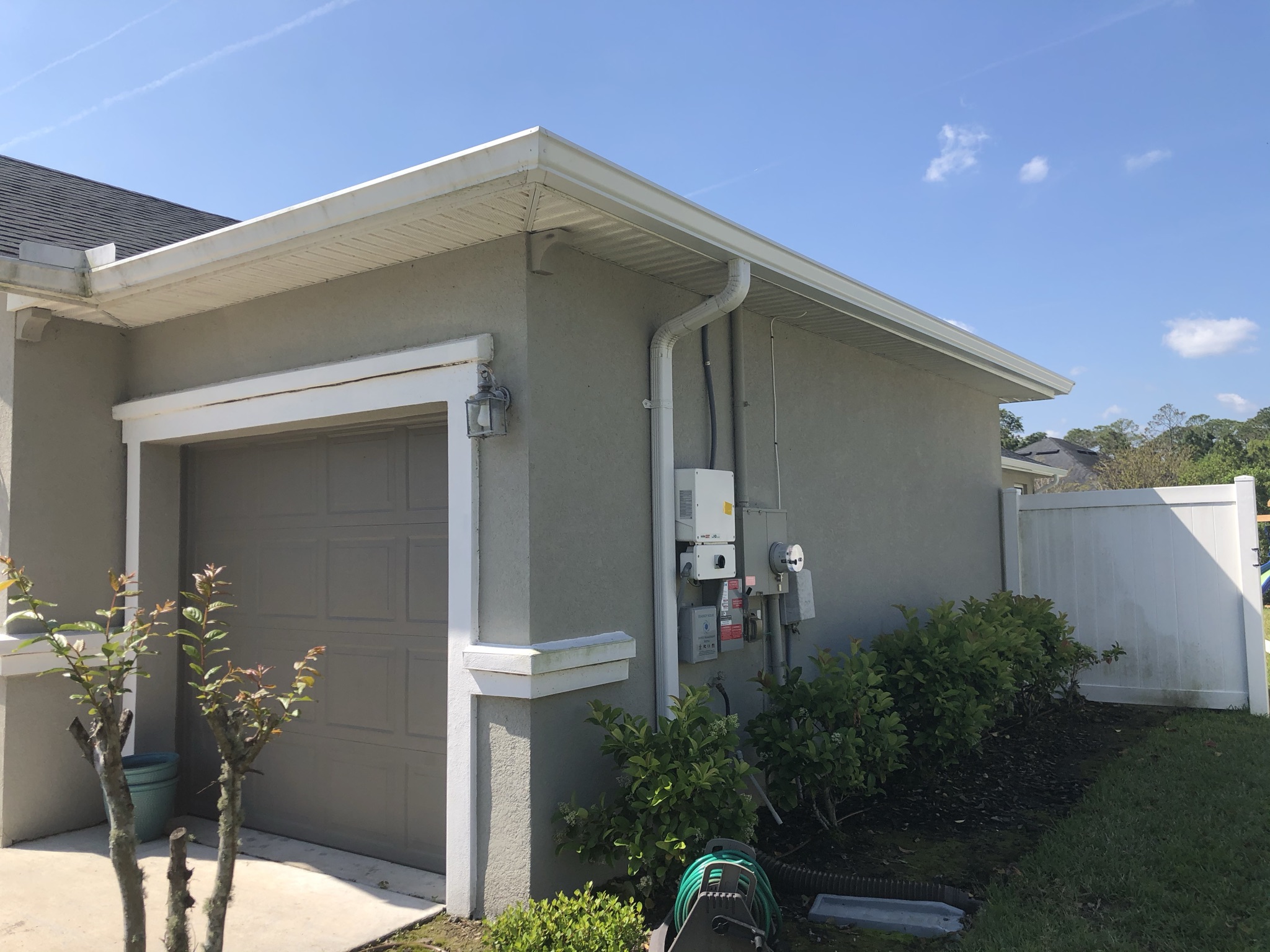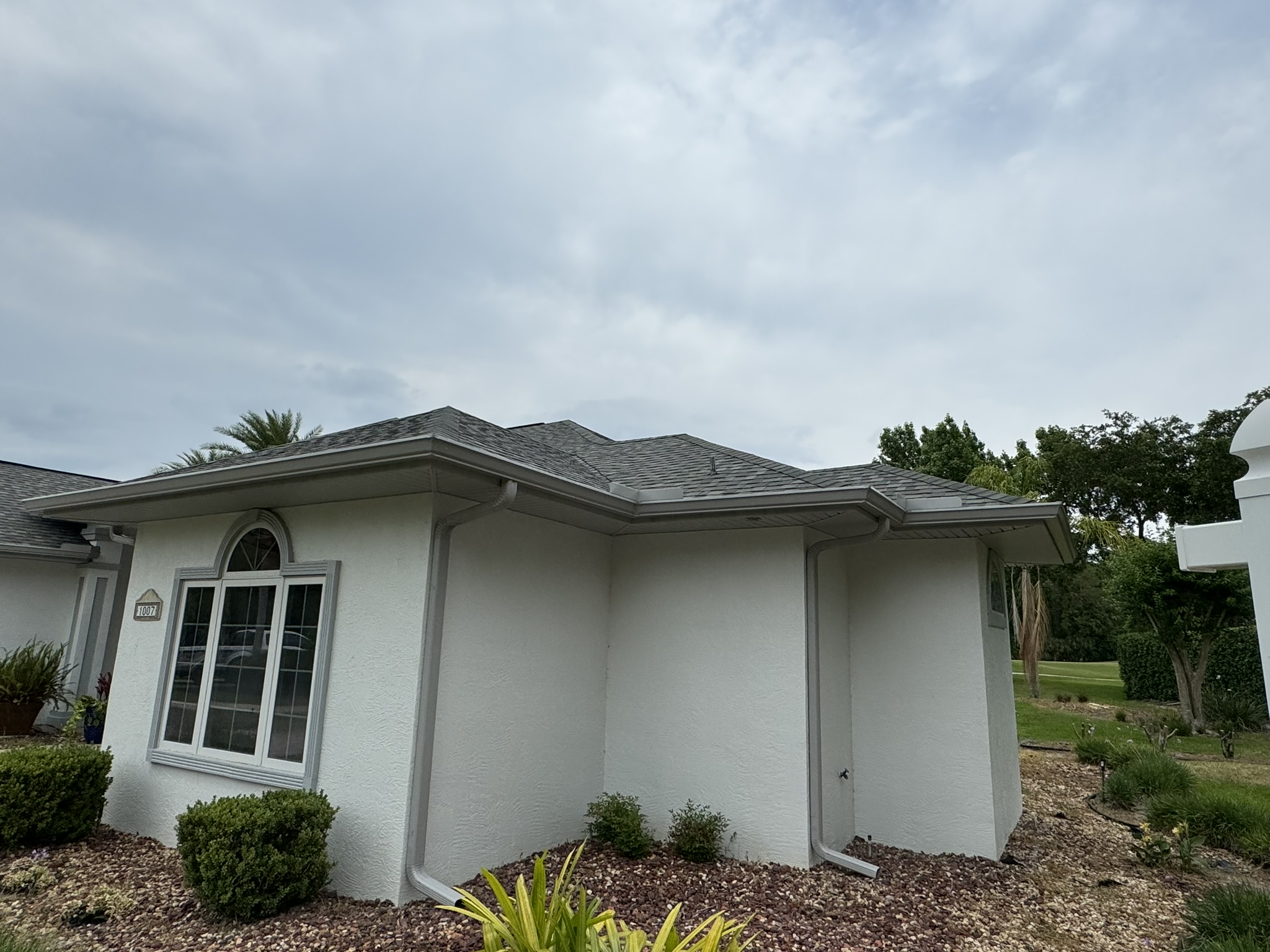 Two-Story Mastic White Gutters & Downspouts