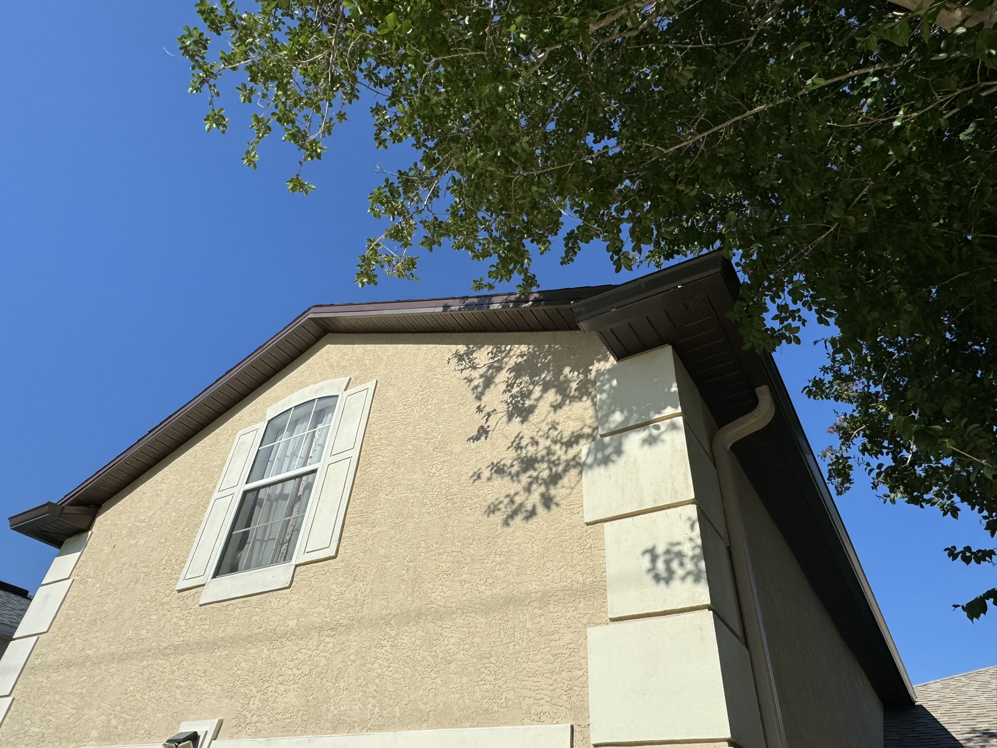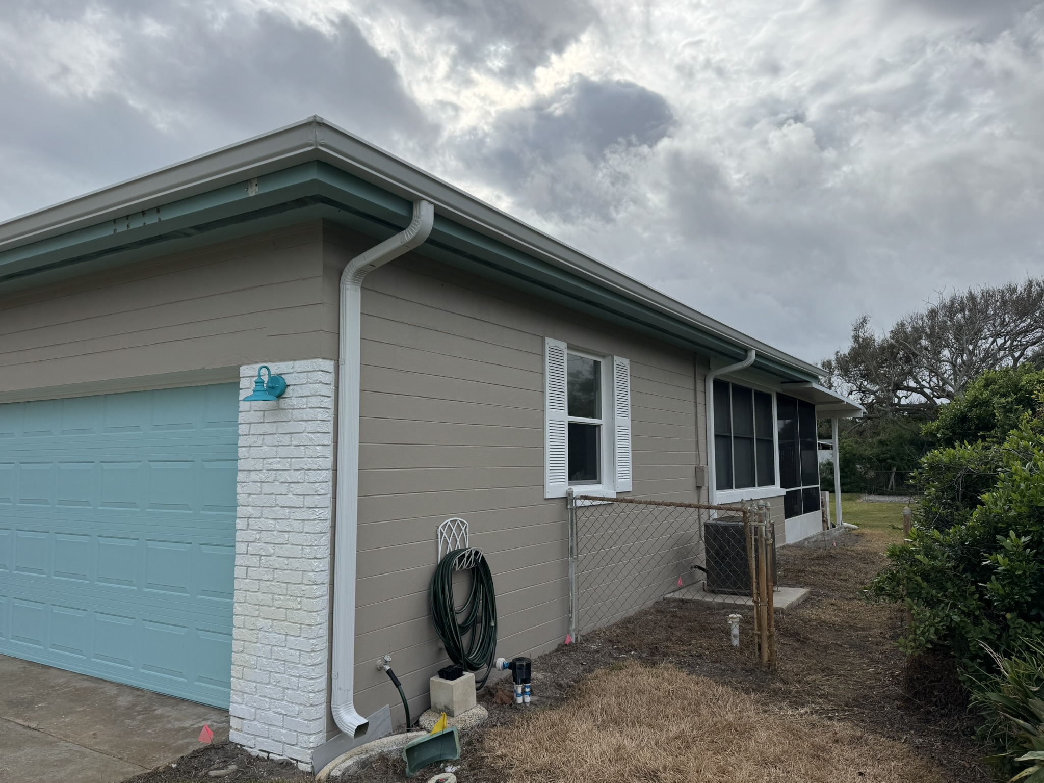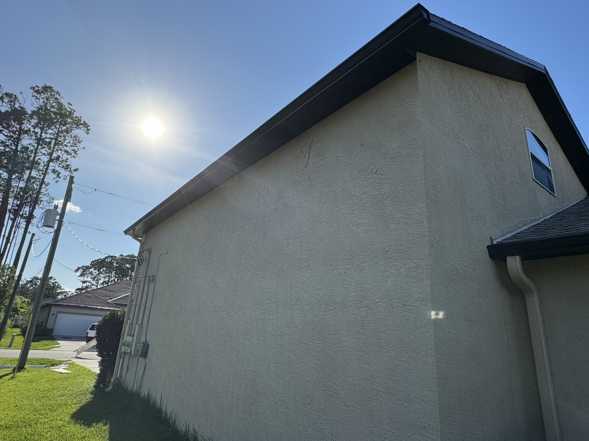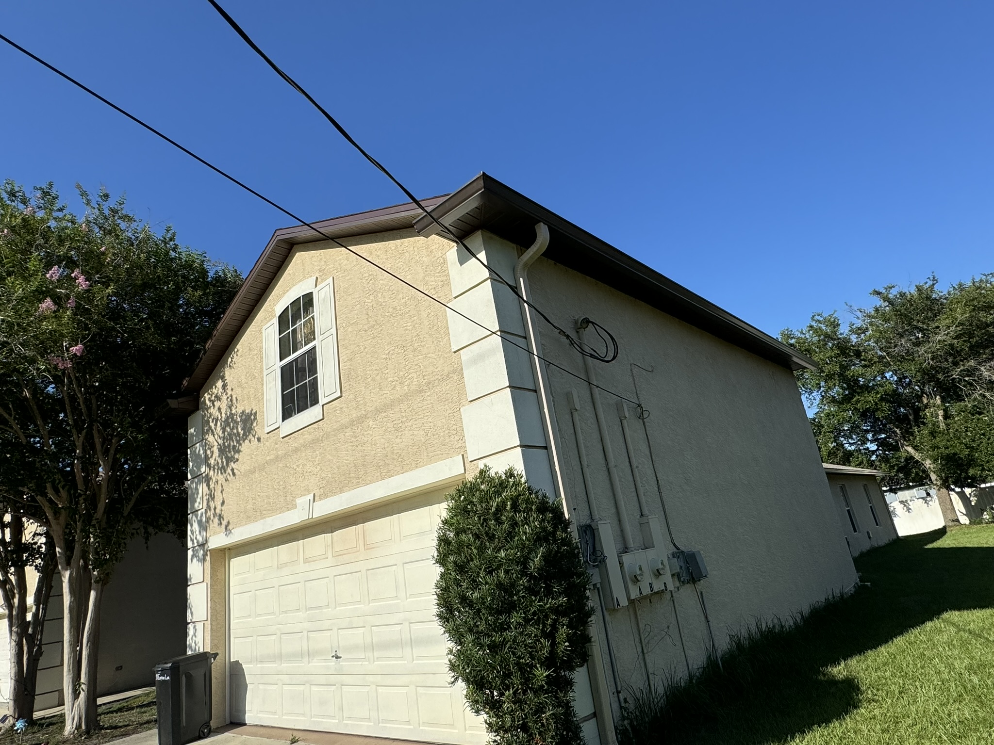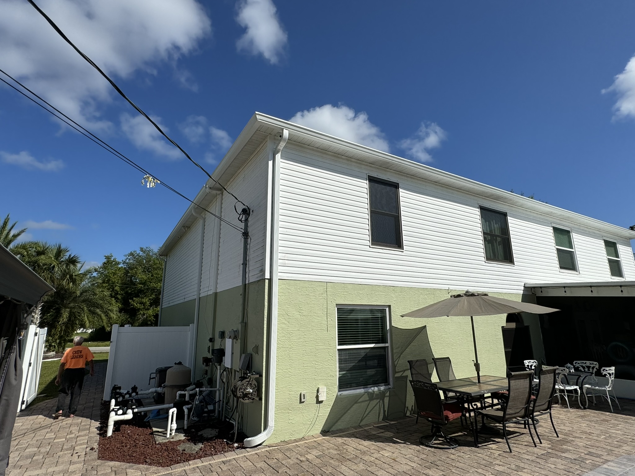 Two-Story Mastic White Gutters & Downspouts