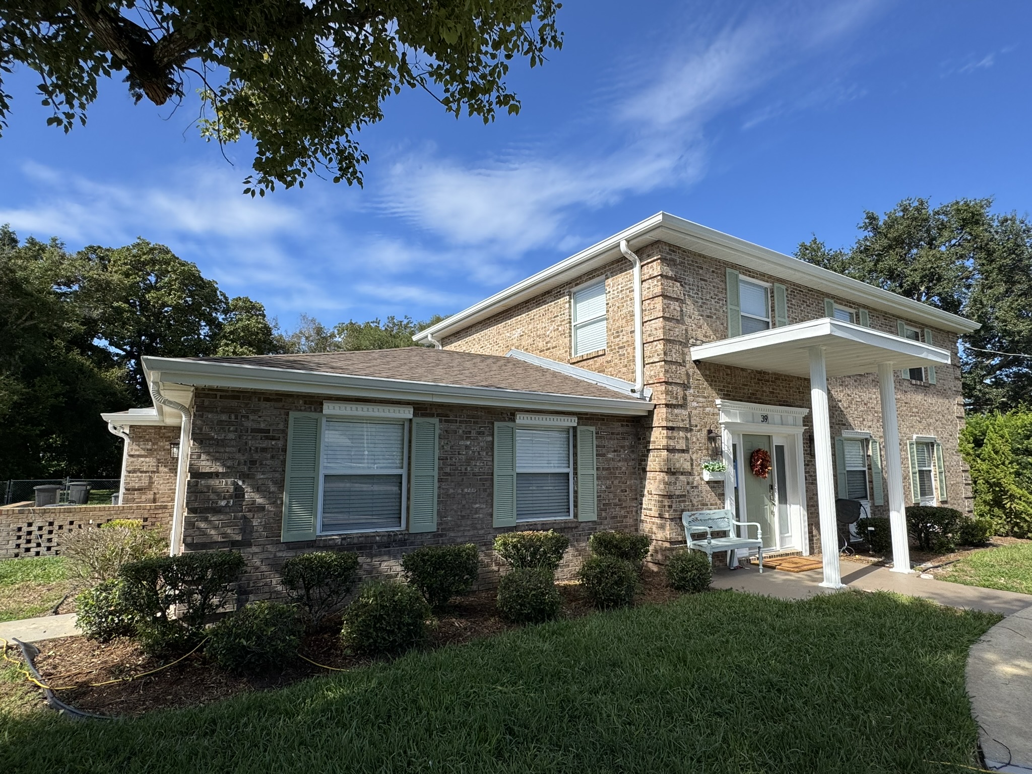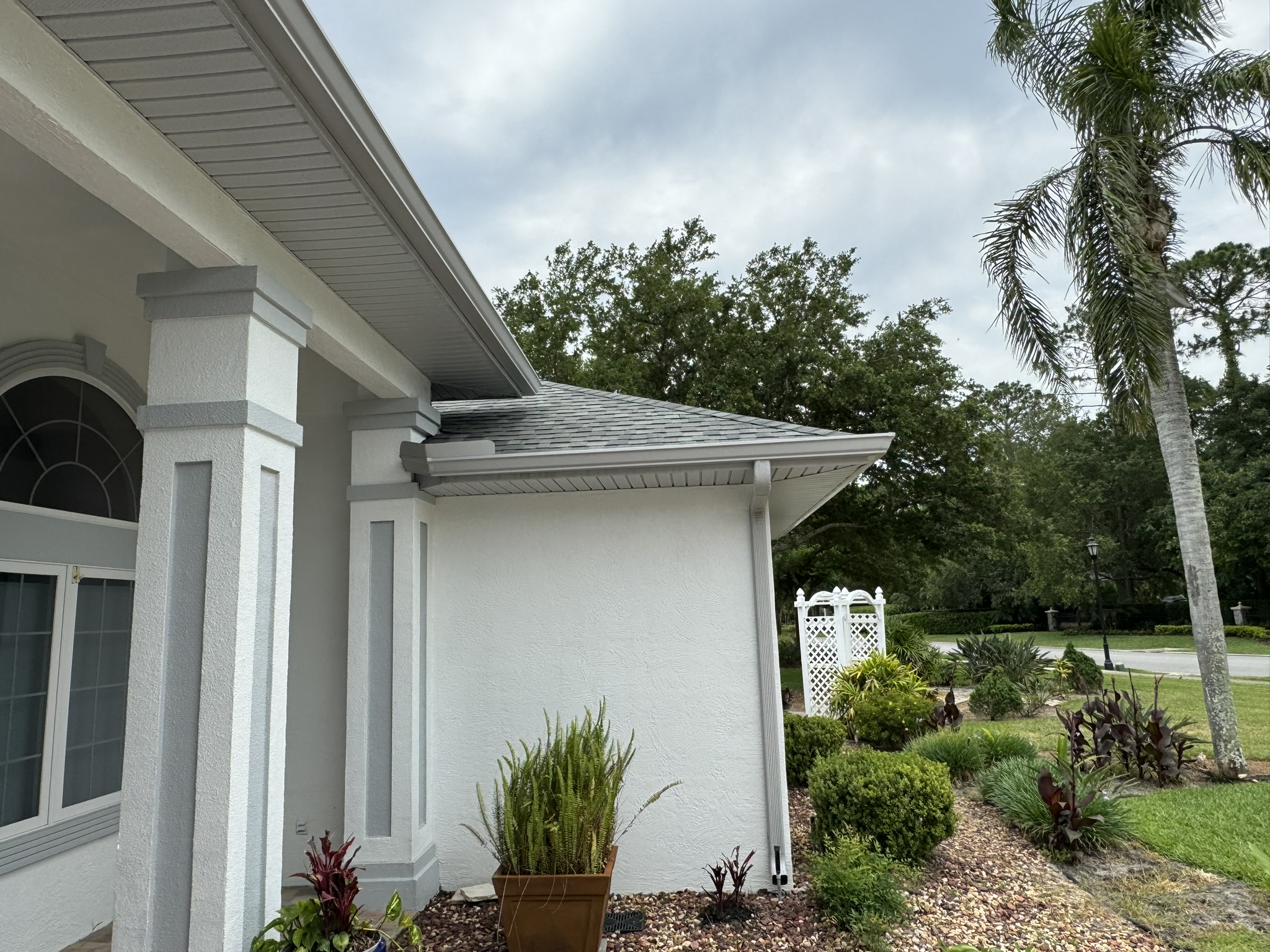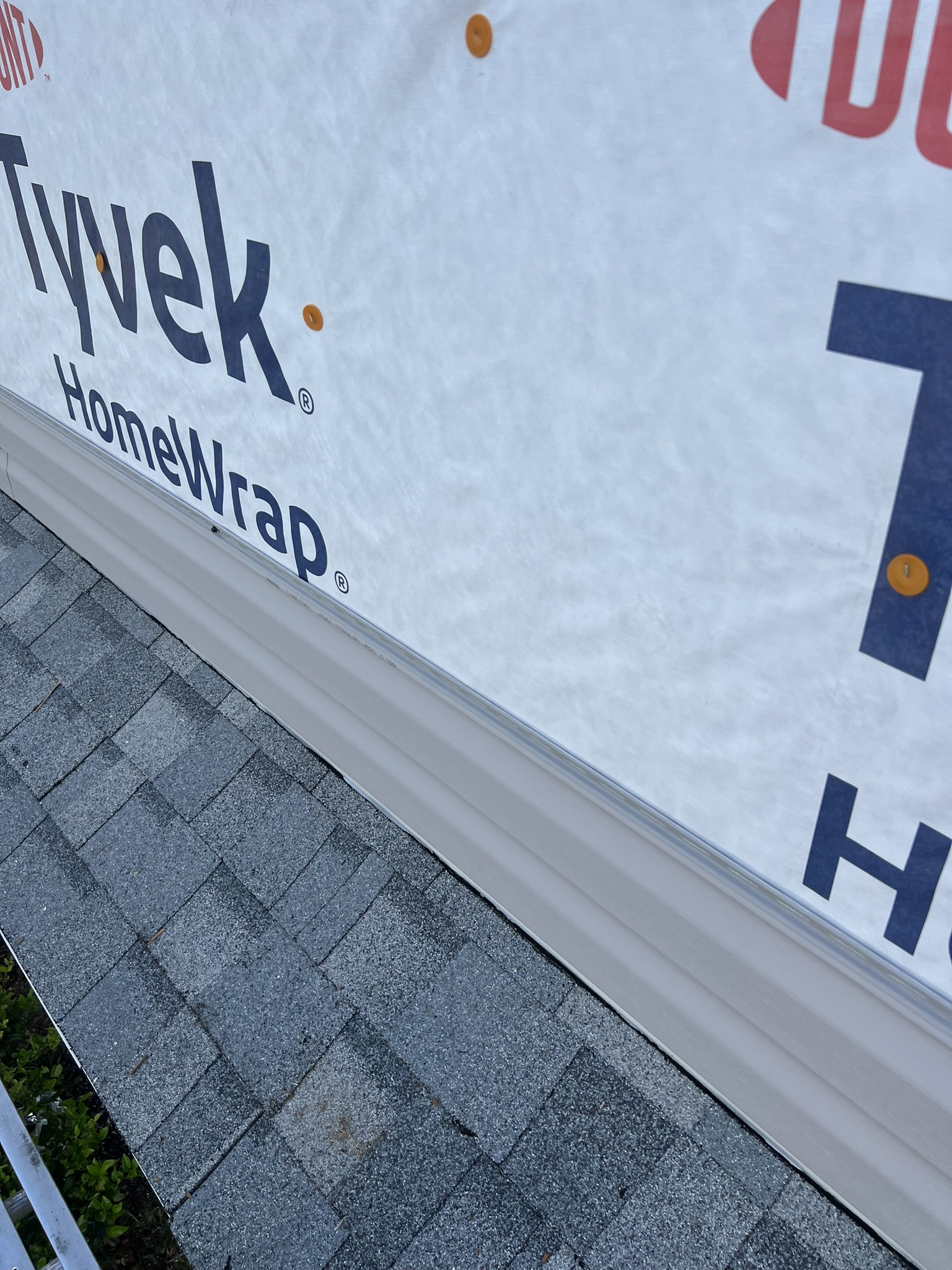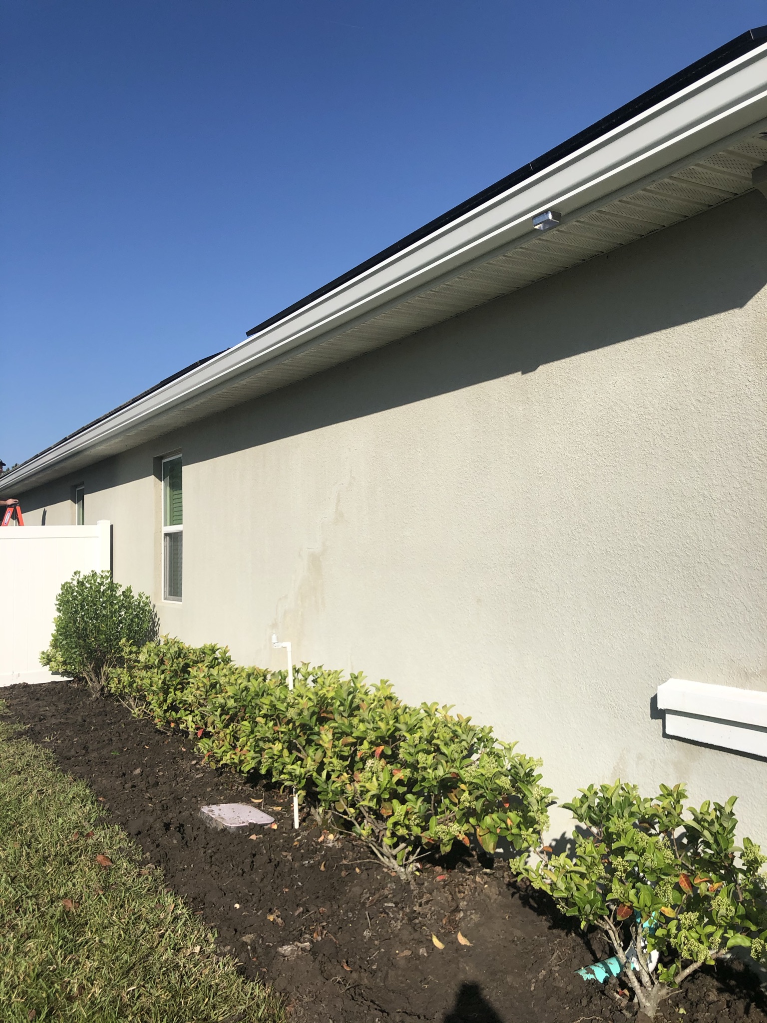 Two-Story Mastic White Gutters & Downspouts