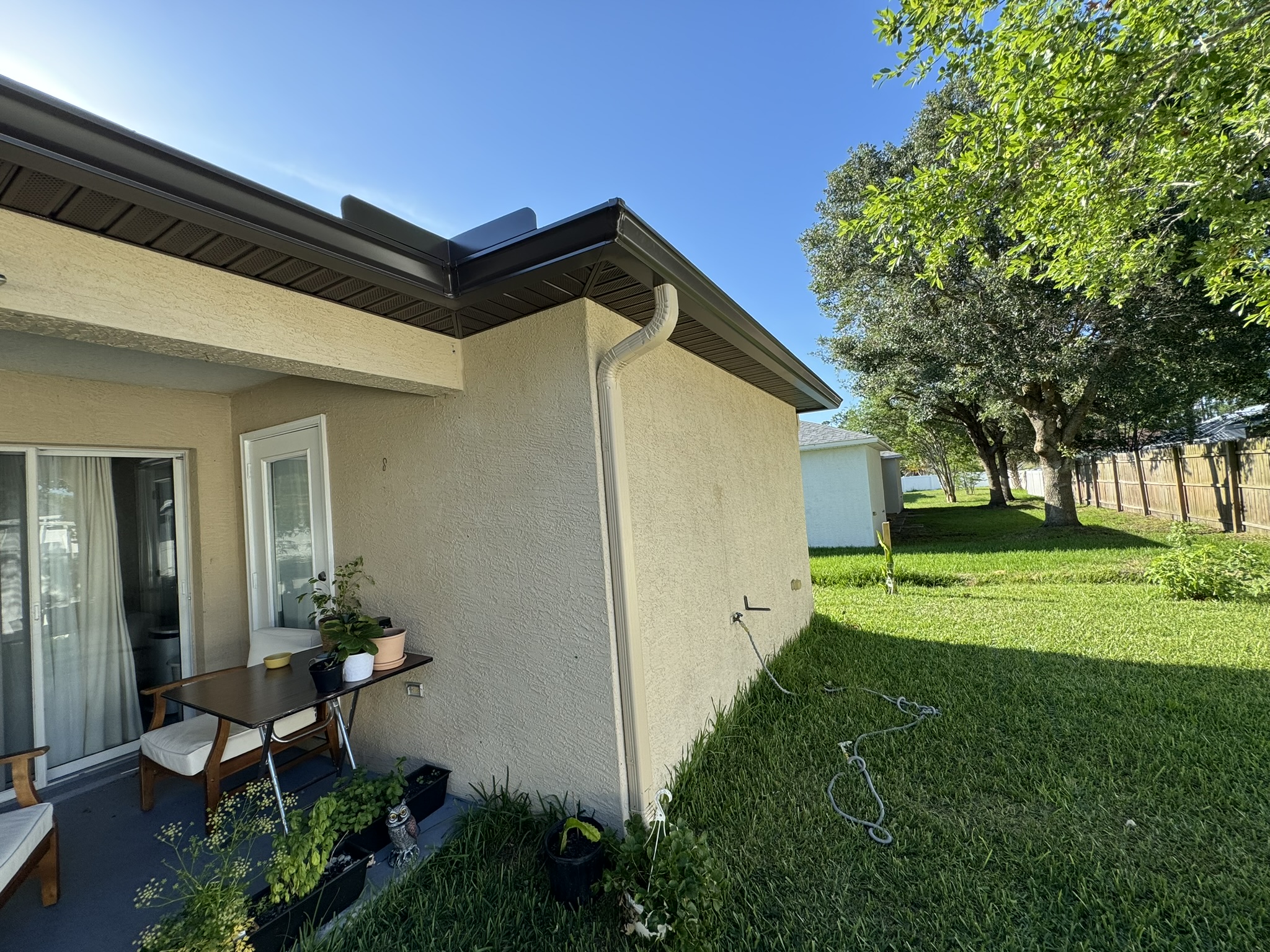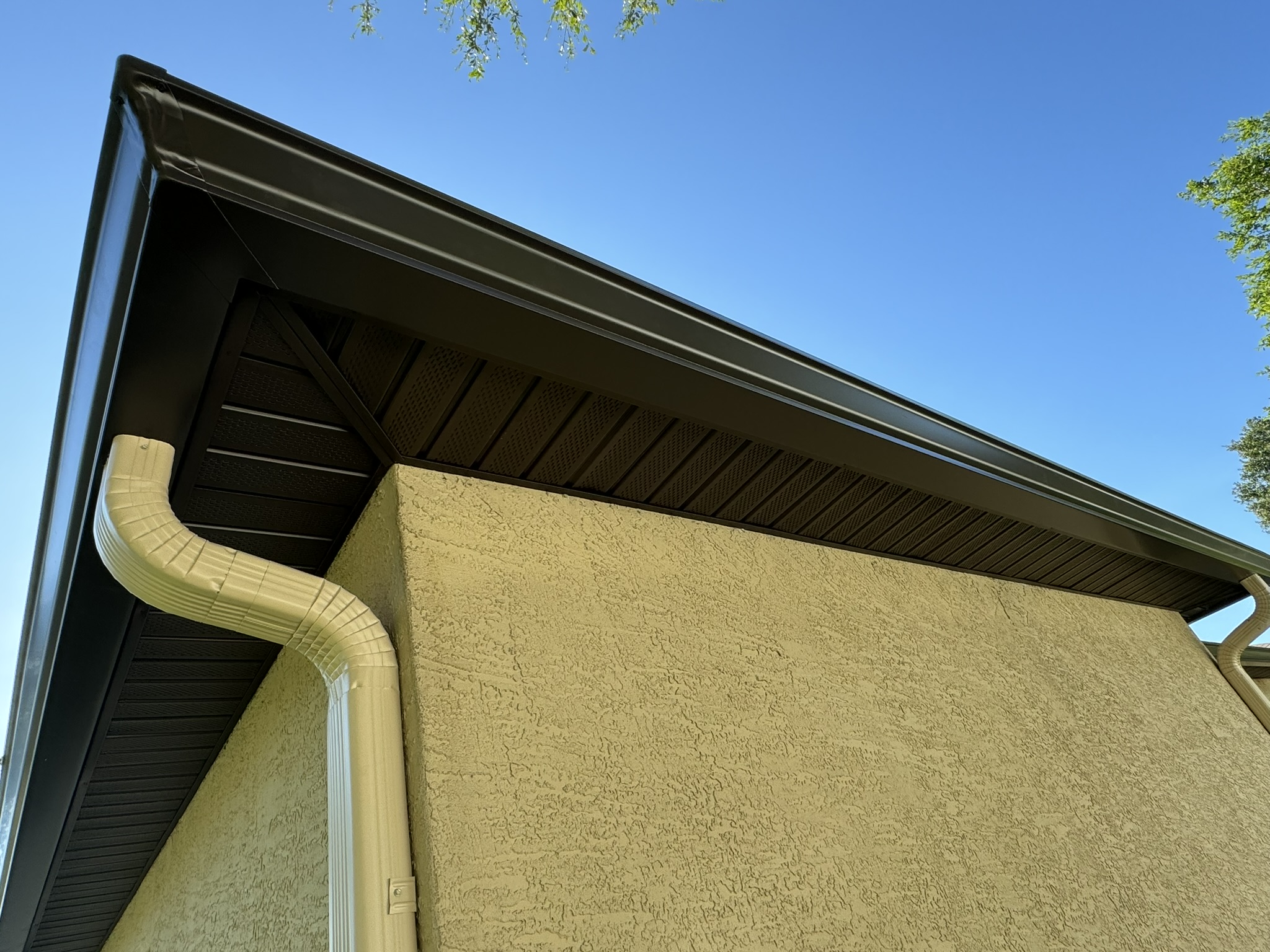 Mastic Musket Brown Universal Soffit & Senox Musket Brown Gutters/Colonial Ivory Downspouts & Bulldog Gutters Guards in Dark Bronze